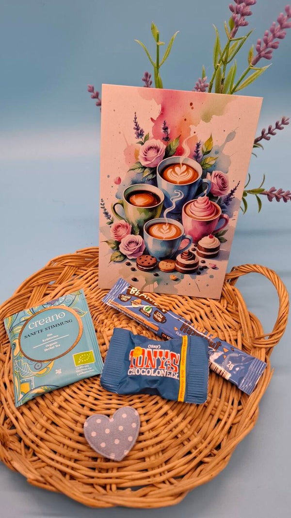 Blauwe kaart, blauwe thee/koffie en een Tony’s mini in blauw.