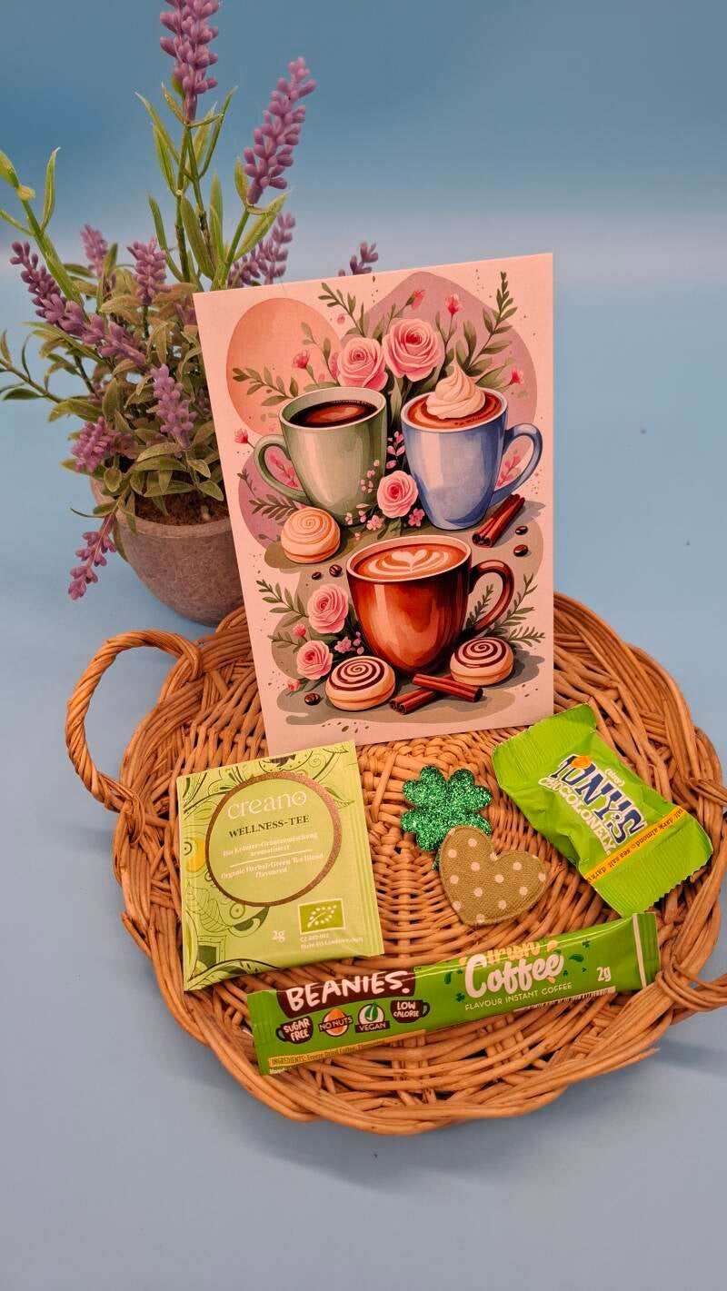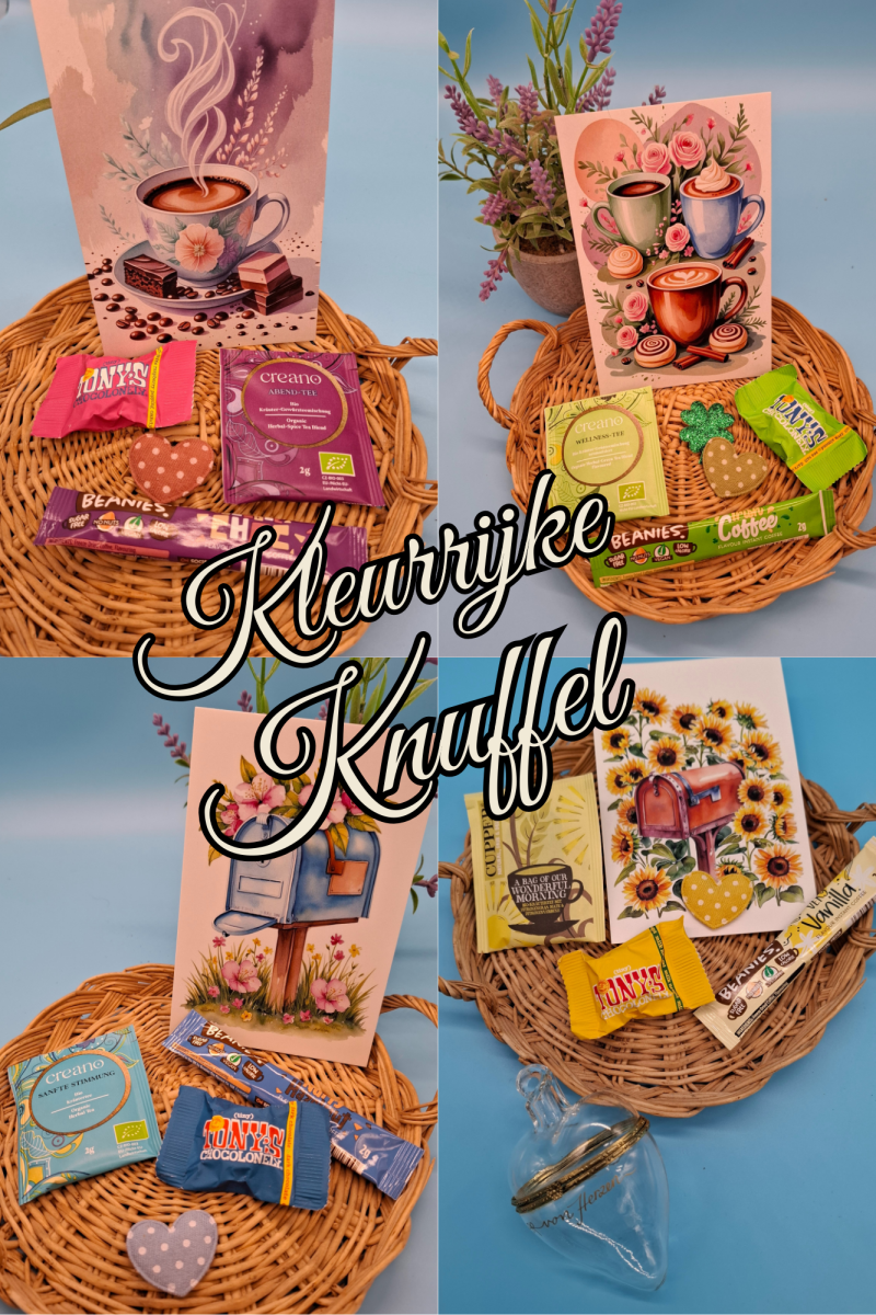 Binnen iedere kleurvariant kan de exacte samenstelling — zoals de kaart, koffiesmaak, theesoort en chocolademini — licht variëren. Zo blijft elke Kleurrijke Knuffel uniek en verrassend. (Zolang de voorraad strekt.)