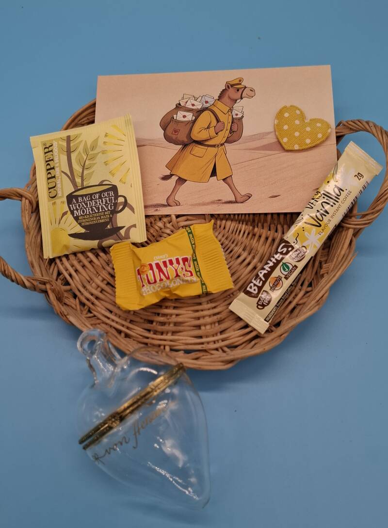 Gele kaart, gele thee/koffie en een Tony’s mini met gele verpakking.